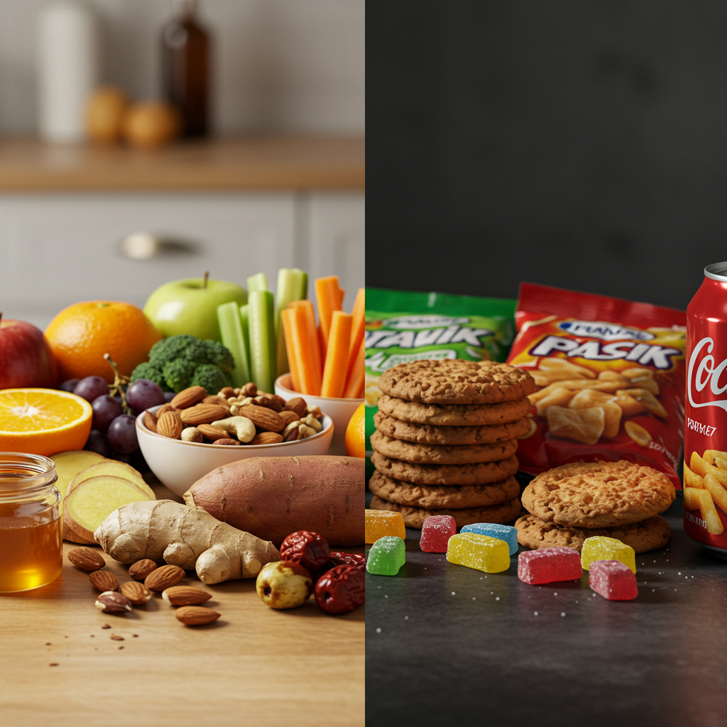 | 주요 성분 | 과일, 채소, 견과류, 곡물 등 | 정제 설탕, 인공 첨가물, 방부제 등 |