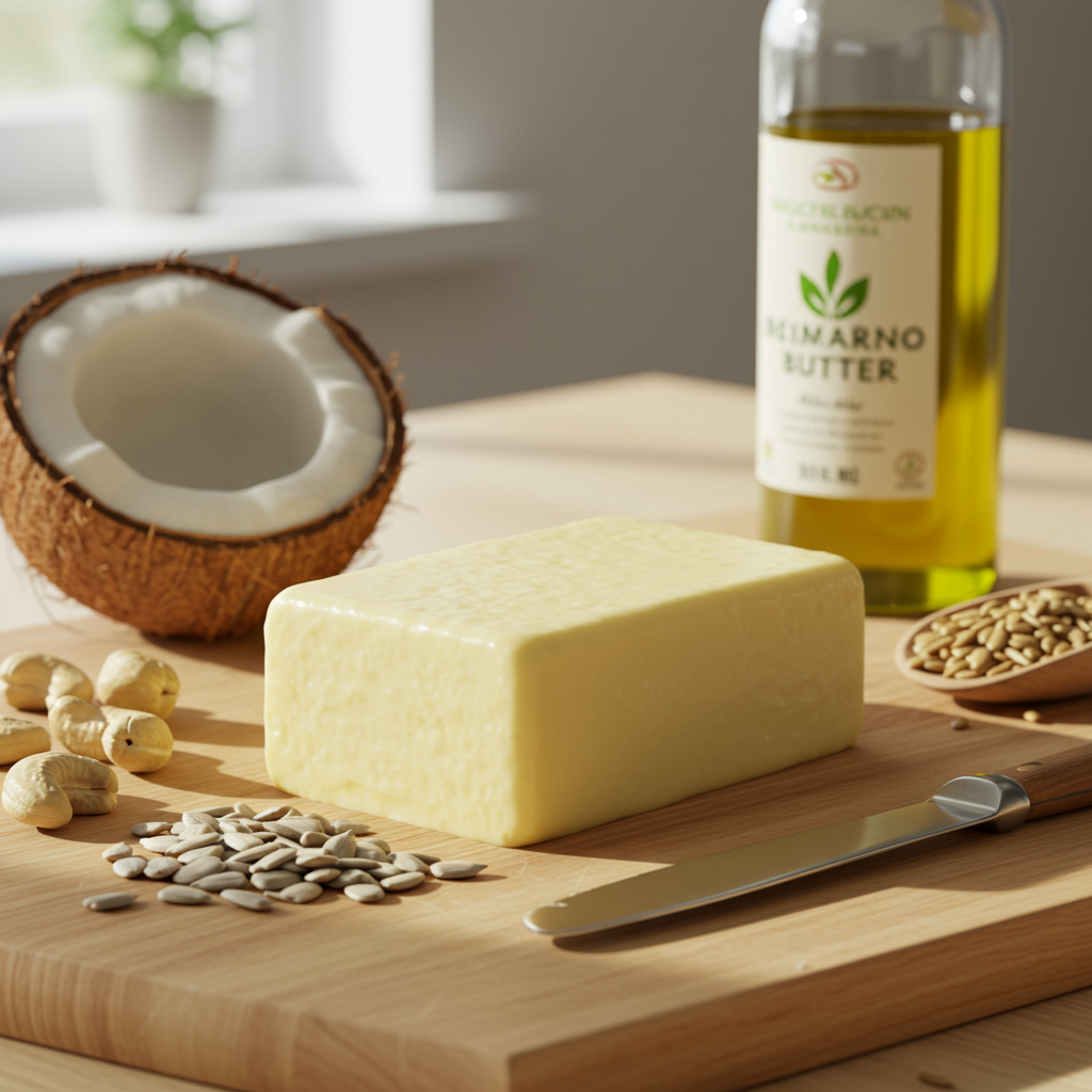 식물성 버터는 이름 그대로 식물성 원료로 만들어진 버터 대체품입니다. 우유에서 추출한 유지방으로 만드는 일반 버터와 달리, 코코넛 오일, 캐슈넛, 해바라기씨 오일, 올리브 오일, 팜유, 카놀라유 등 다양한 식물성 오일을 블렌딩하여 만들어져요. 여기에 식물성 레시틴 같은 유화제를 첨가해 일반 버터와 유사한 부드러운 식감과 풍미를 구현한답니다. 동물성 원료가 전혀 들어가지 않기 때문에 비건(채식주의자) 식단을 따르는 분들에게는 더할 나위 없는 선택이죠.