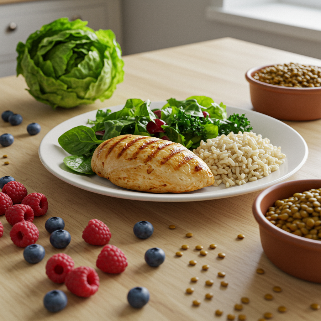 - 살코기 및 콩류: 닭가슴살, 생선, 두부, 렌틸콩 등은 단백질이 풍부하여 포만감을 주고 혈당 반응을 늦춥니다.