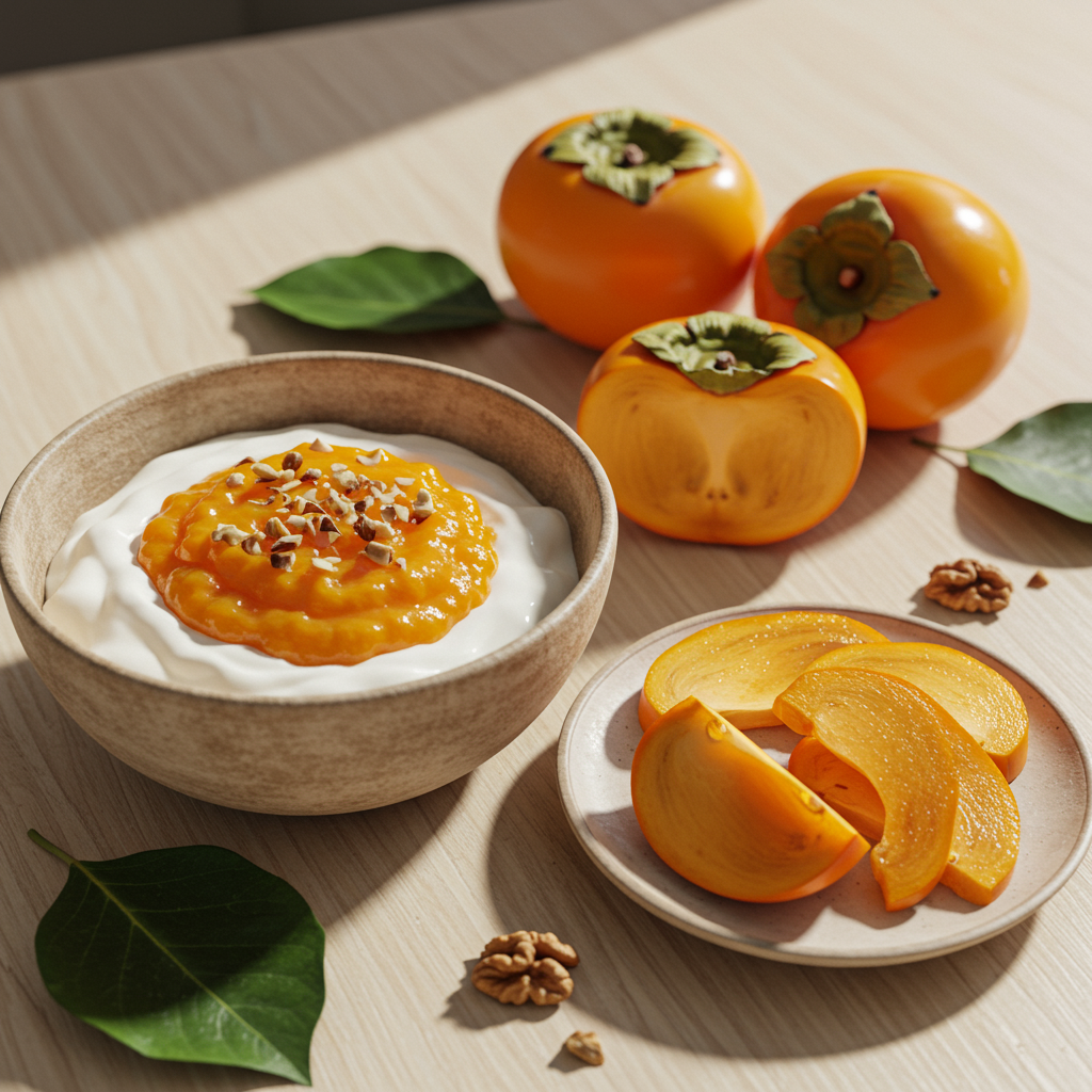 - 만드는 법: 홍시를 으깨거나 믹서에 갈아 퓨레를 만들고, 요거트 위에 얹은 후 견과류를 뿌려주세요.